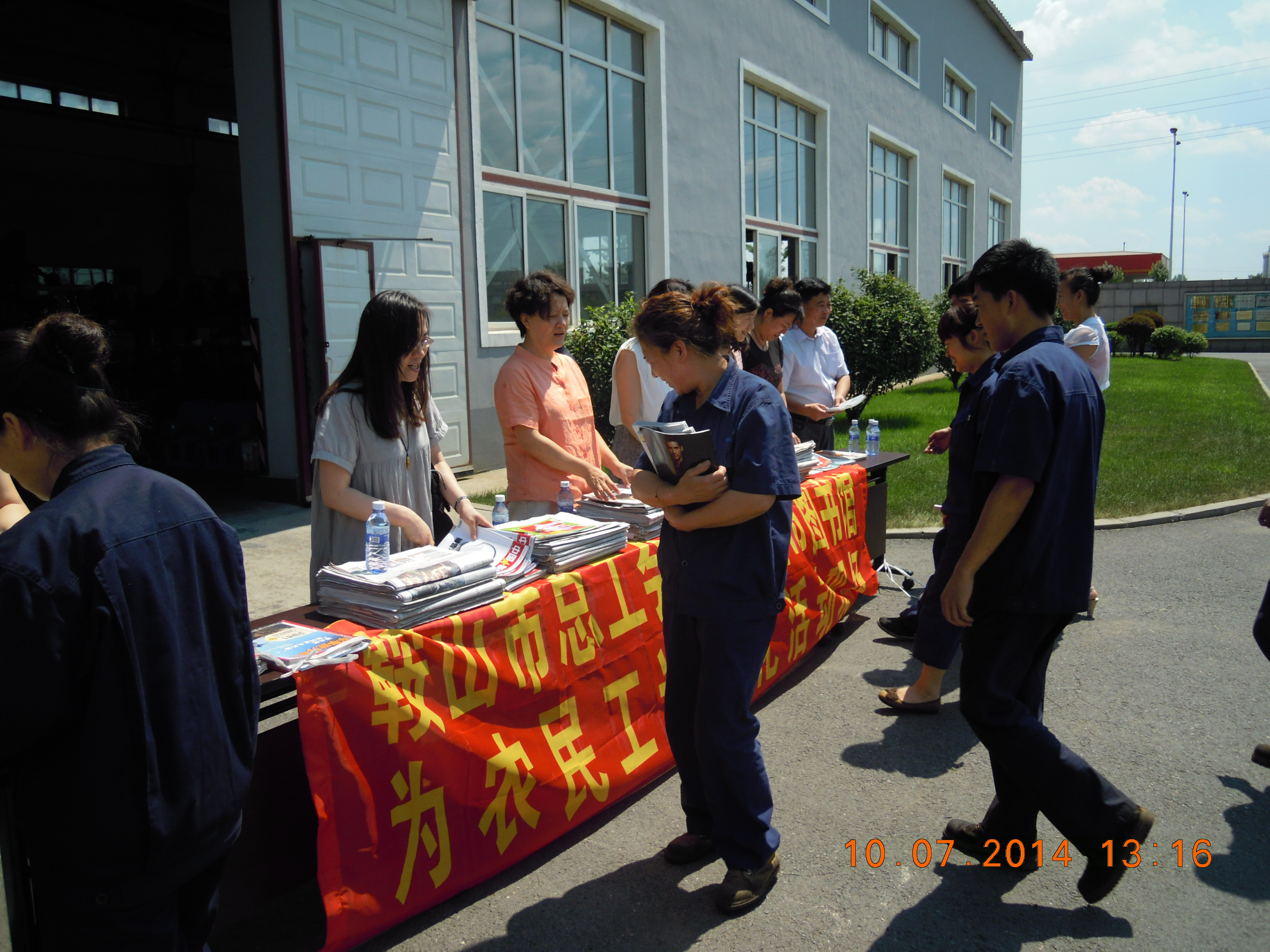 为加强职工防暑降温和安全卫生知识宣传教育,确保职工平安度夏,丰富广大职工特别是农民工朋友的文化生活,7月10日,鞍山市图书馆与市总工会领导来到辽宁佳和机械制造有限公司共同举办了“送清凉送图书”活动。考虑到该厂400余名职工的阅读需求,鞍山市图书馆精心挑选了适合工人师傅阅读的期刊50种150册、报纸10种200份,并亲手送到工人师傅手里,了解其阅读需求和建议,受到了广大职工的欢迎。职工代表接过这些资料,纷纷表示:这些资料送的太及时了,而且都很实用,能帮助职工学习很多知识,感谢社会各届的关心和关爱。