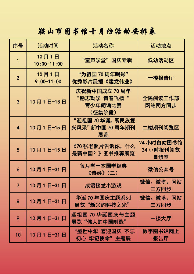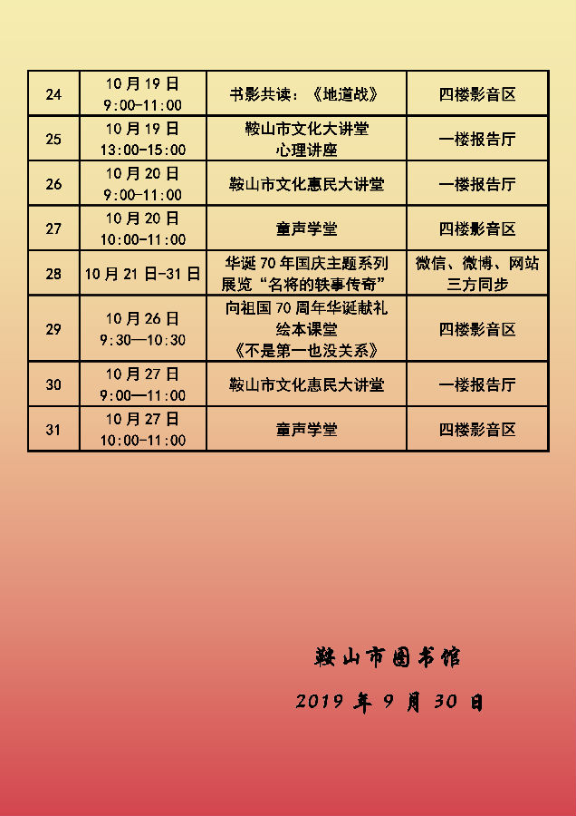 鞍山市图书馆十月份活动安排表