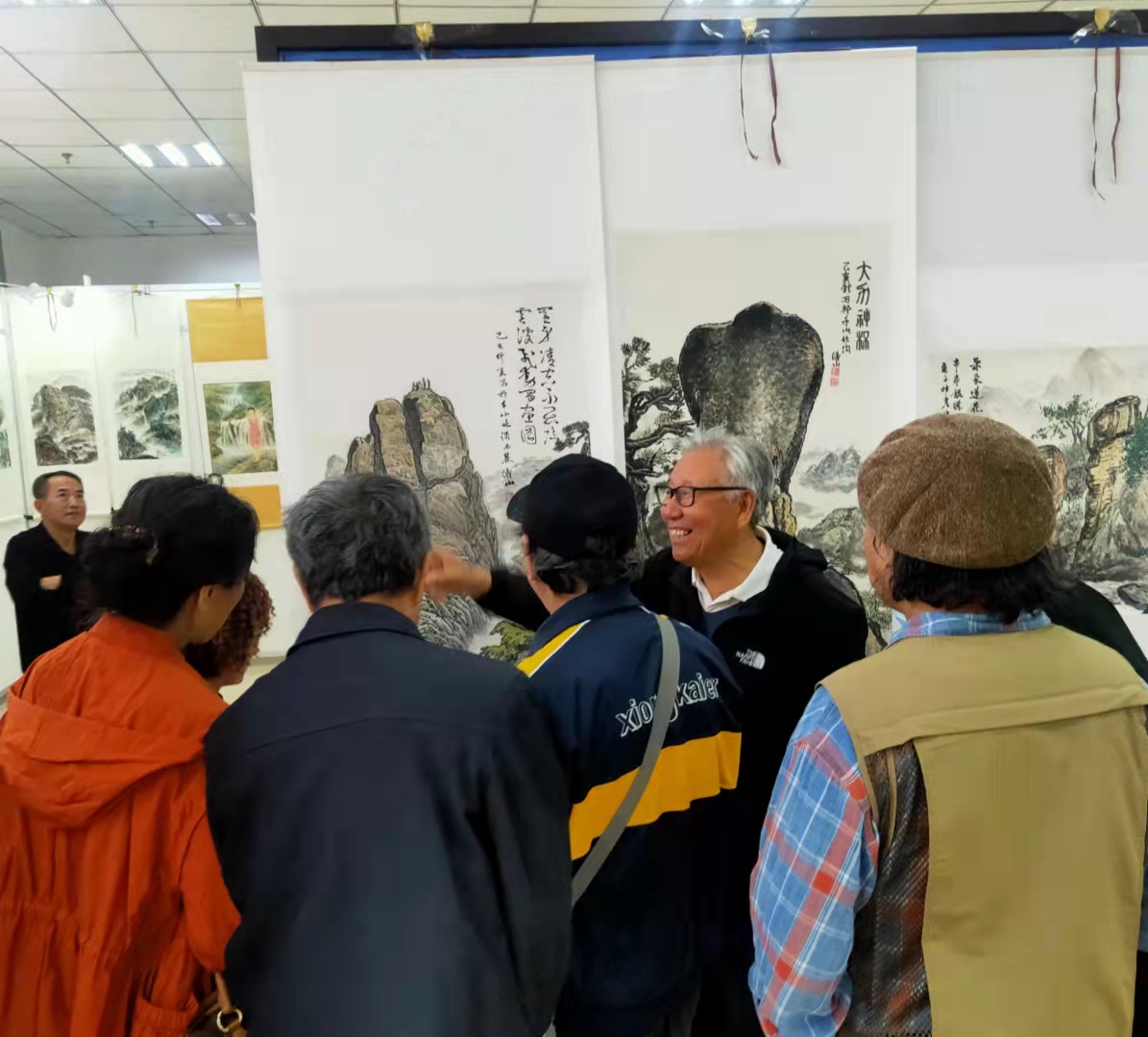 “钢都五叟”平均年龄75岁,由庞守嘉、高德爽、范世锦(范音)、马清芳、段云富五位画家组成。他们怀着对家乡的热爱,对大美千山的无尽抒怀,长年深耕千山水墨画创作。在创作过程中,他们发现千山山峰险峻、苍松古刹、佛道同居。千山山脉的石质独特,山石突兀,浑圆粗砬、仅用传统皴法难以表现。为彰显千山盛景,他们不畏寒暑、跋山涉水、风餐露宿,几乎踏遍了千山的每座崇山峻岭,在艰难的跋涉中发现了许多鲜为人知的奇峰怪石。并用带有灵感与激情的笔墨,将千山山脉的石质独特,山石突兀,浑圆粗砬、在传统方法的基础上尝试用“跺、擦、皴”的方法画山石,用“菁、波、皴”的方法表现植被,开创出了独特的“千山画派画法”。此次书画作品展共展出书画作品80幅,以生动的笔触再现了千山大佛、老子说道、云霞关、中会寺冷屏峰、大安禅林、一线天、天上天等大美风光,让人如临其境。本次展览得到了读者的广泛好评,开展当天就接待参观读者200余人次,多位书画爱好者参观后,纷纷波墨留言。