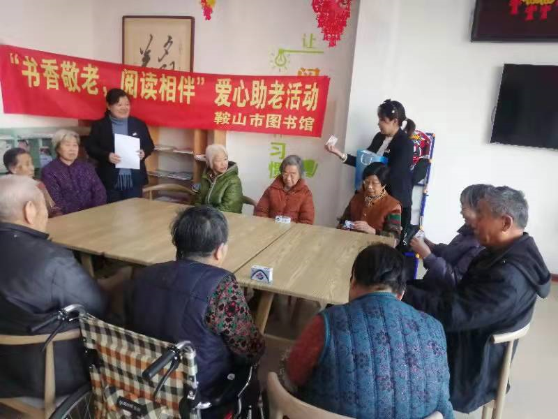 2022年1月5日上午,鞍山市图书馆爱心助老活动开年第一站来到位于铁西区的慧德老年养护中心,开展面对面的朗读与有奖答题活动,20余名老年读者参加了活动。