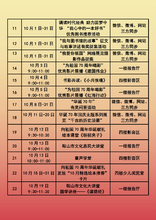 鞍山市图书馆十月份活动安排表