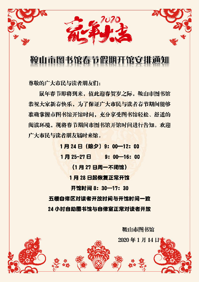 鞍山市图书馆春节期间开馆安排通知
