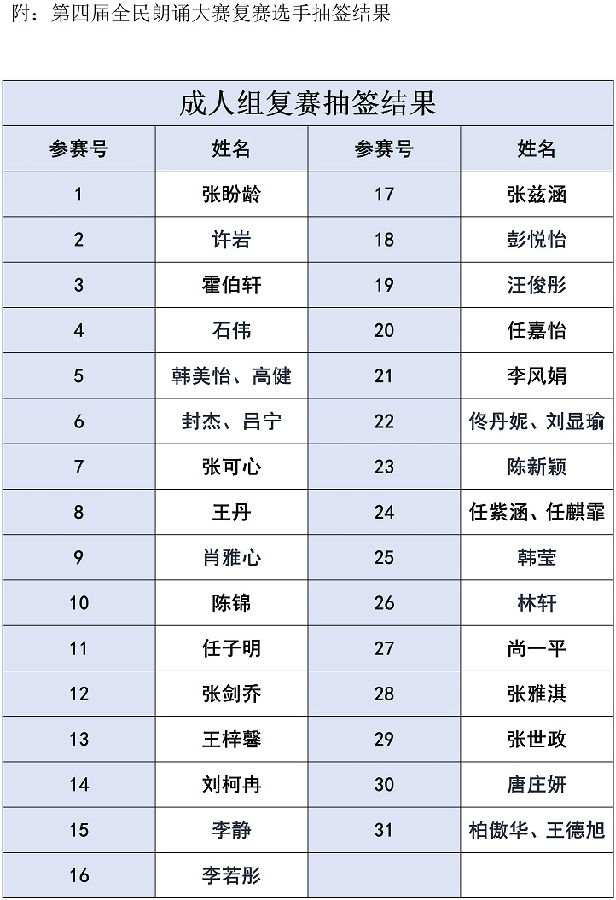 由鞍山市文化旅游和广播电视局、鞍山市教育局、共青团鞍山市委员会、鞍山市妇女联合会、鞍山市文化旅游发展促进中心联合主办,市图书馆、市朗诵艺术协会承办的“雅言诵古韵 书香满钢城”鞍山市第四届全民朗诵大赛复赛将于9月21、22日在鞍山市图书馆一楼报告厅开赛,现将复赛抽签结果、复赛要求等相关内容公布如下: